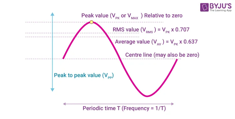 - Average Value: The average of all values over a period. For a sinusoidal waveform over one complete cycle, the average value is zero because the positive and negative halves cancel each other out.
