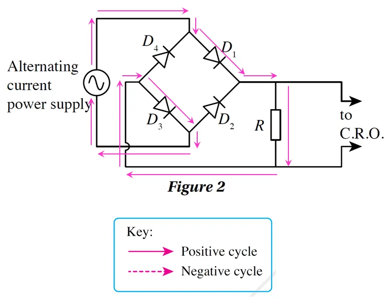 - A Bridge Rectifier, using four diodes, is a common full-wave rectifier circuit. Pairs of diodes conduct alternately for each half-cycle, ensuring current flows through the load in a single direction.