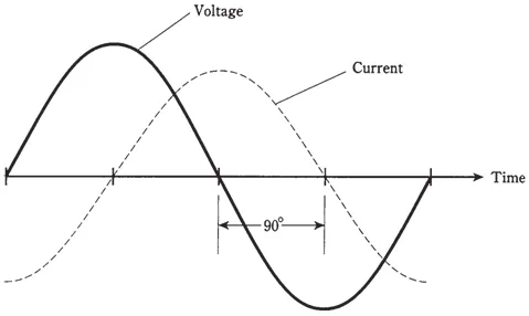 Phasor Diagram: The phasor diagram shows the voltage phasor 90∘ behind the current phasor.